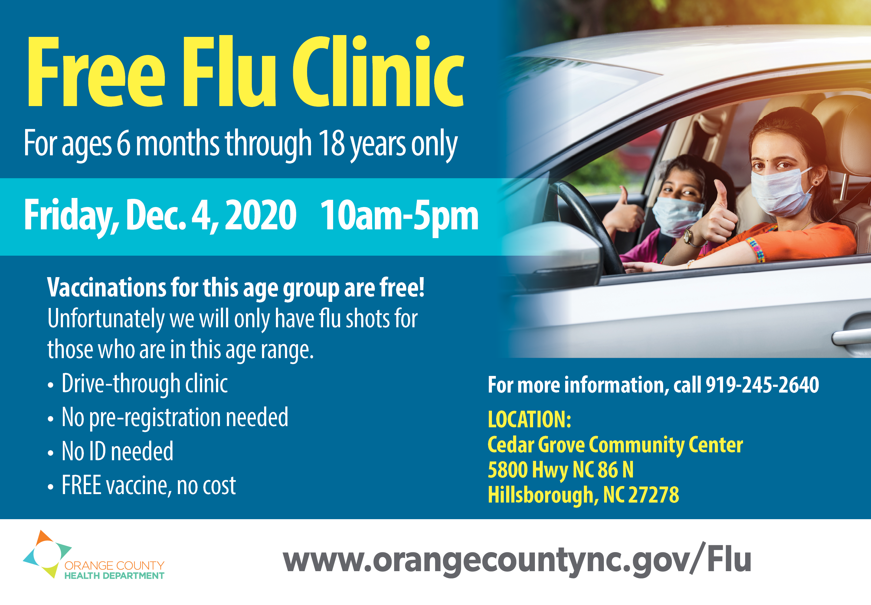 On Friday, December 4th OCHD, Orange County EMS and the Cedar Grove Community Center will host a flu clinic. Where: Cedar Grove Community Center: 5800 Hwy NC 86 N, Hillsborough, NC 27278 When: Friday December 4, 2020 from 10:00 am – 5:00 pm - Flu clinic for people 6 months through 18-years-old.