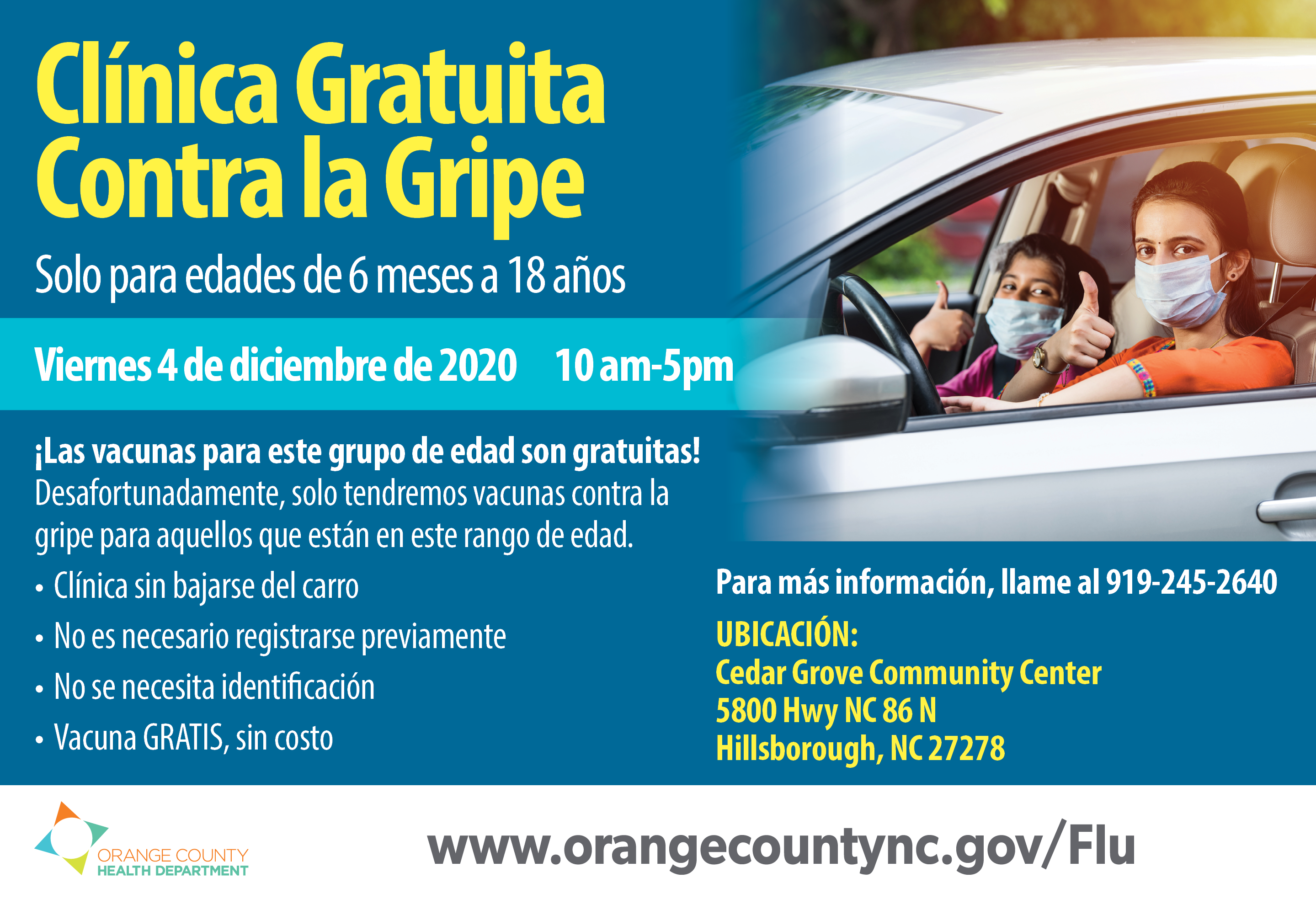 On Friday, December 4th OCHD, Orange County EMS and the Cedar Grove Community Center will host a flu clinic. Where: Cedar Grove Community Center: 5800 Hwy NC 86 N, Hillsborough, NC 27278 When: Friday December 4, 2020 from 10:00 am – 5:00 pm - Flu clinic for people 6 months through 18-years-old.
